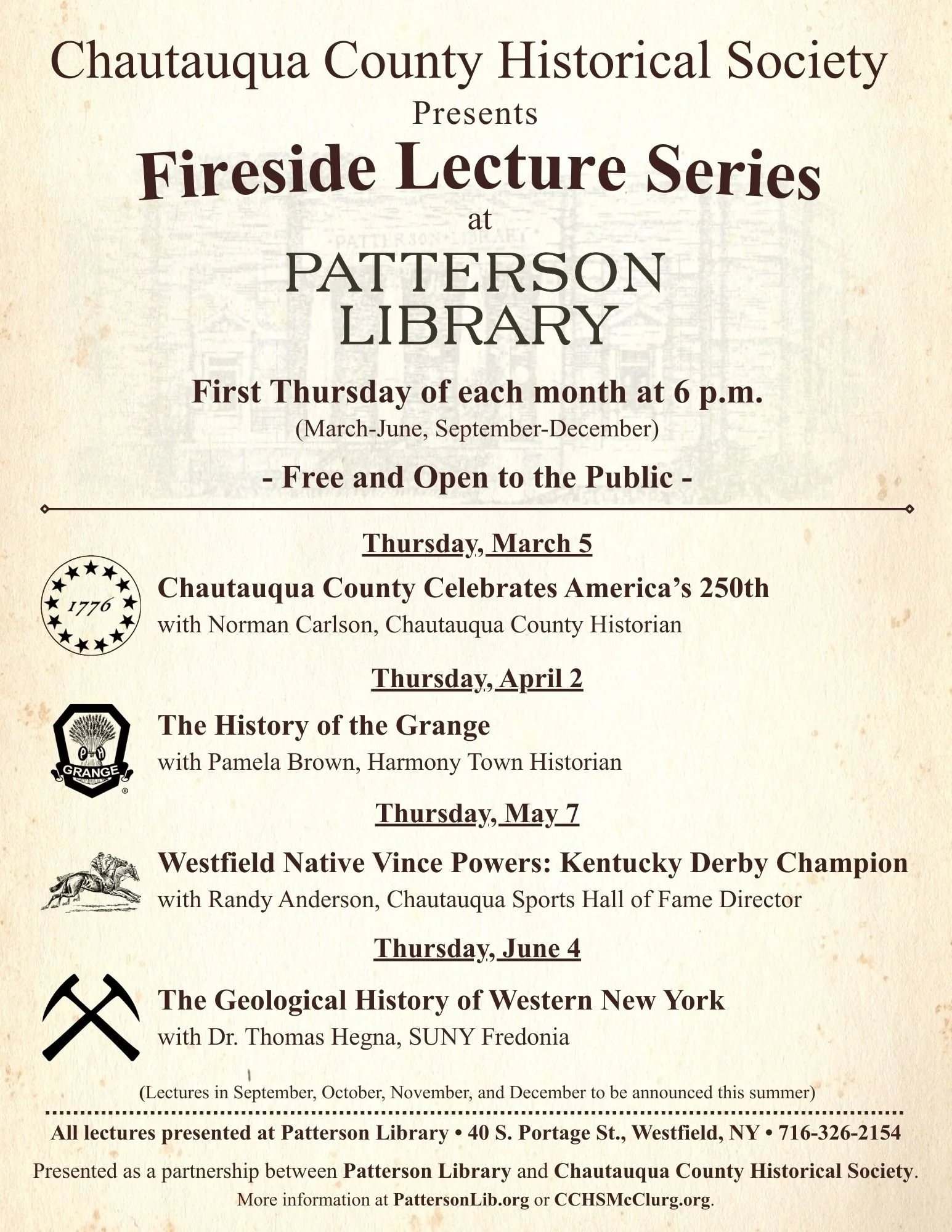 WESTFIELD, NY — A new historical lecture series, free and open to the public, will begin this March at Patterson Library. Known as the “Fireside Lecture Series,” this new programming is a collaboration between the Chautauqua County Historical Society (CCHS) and the library.